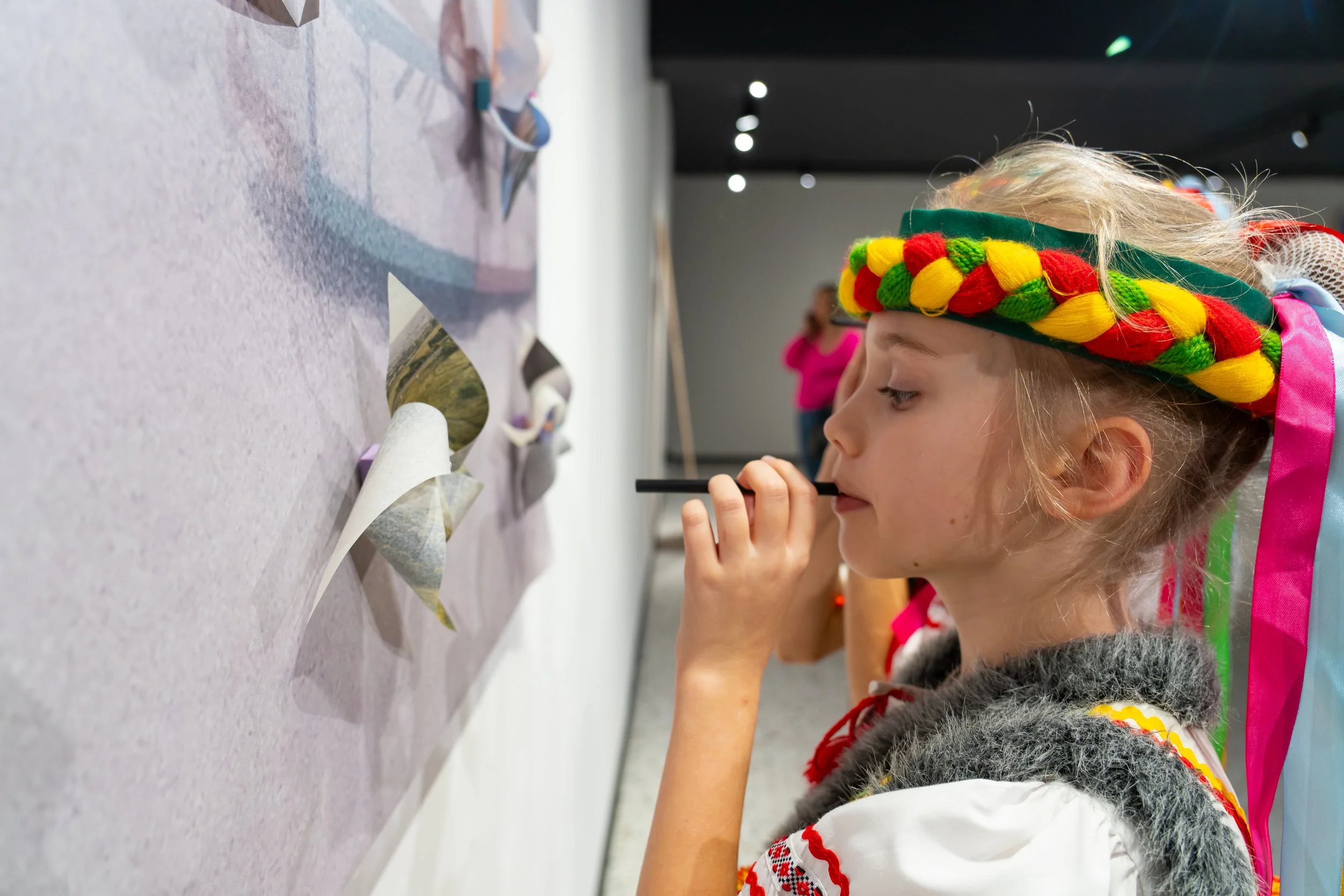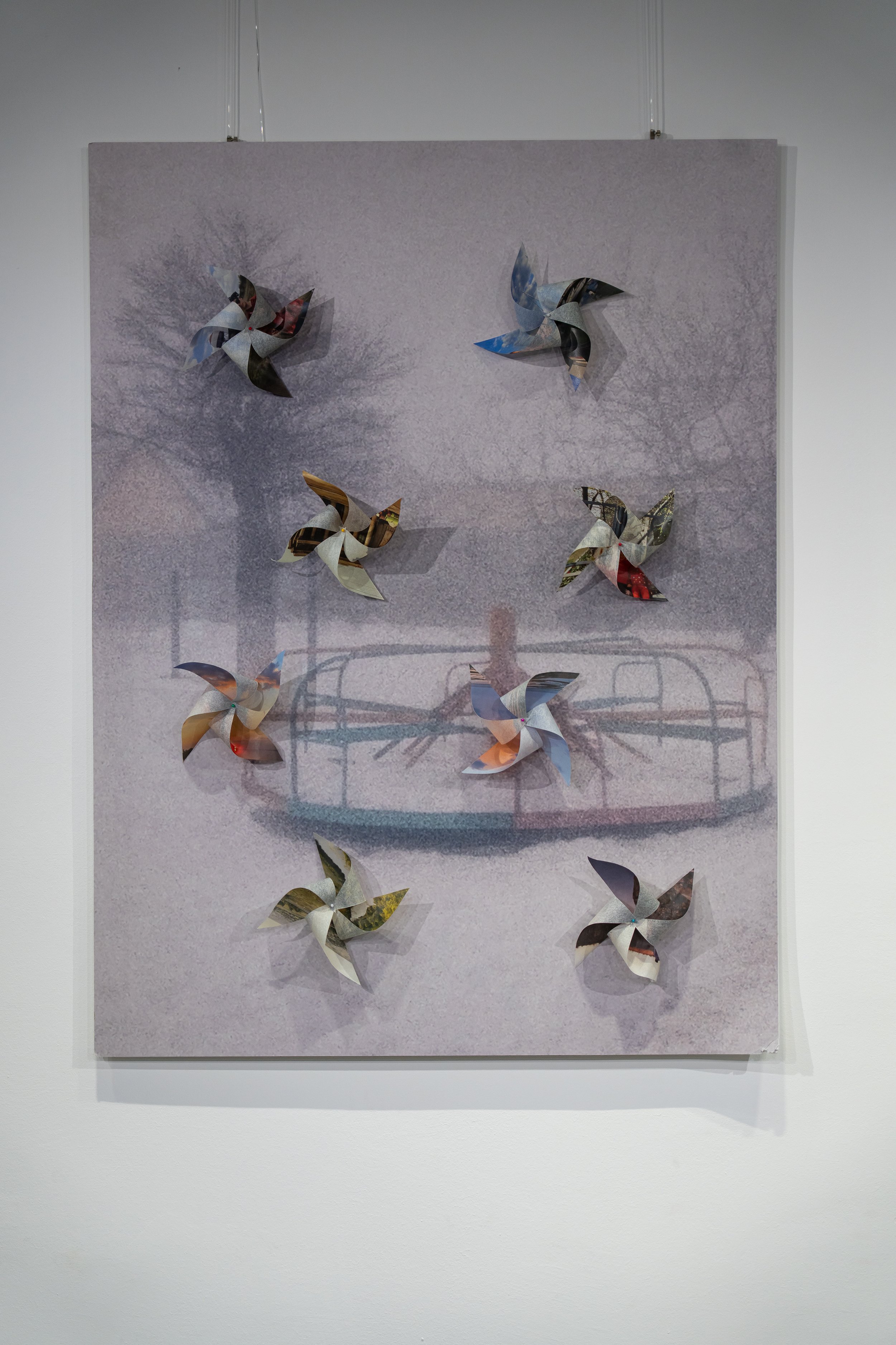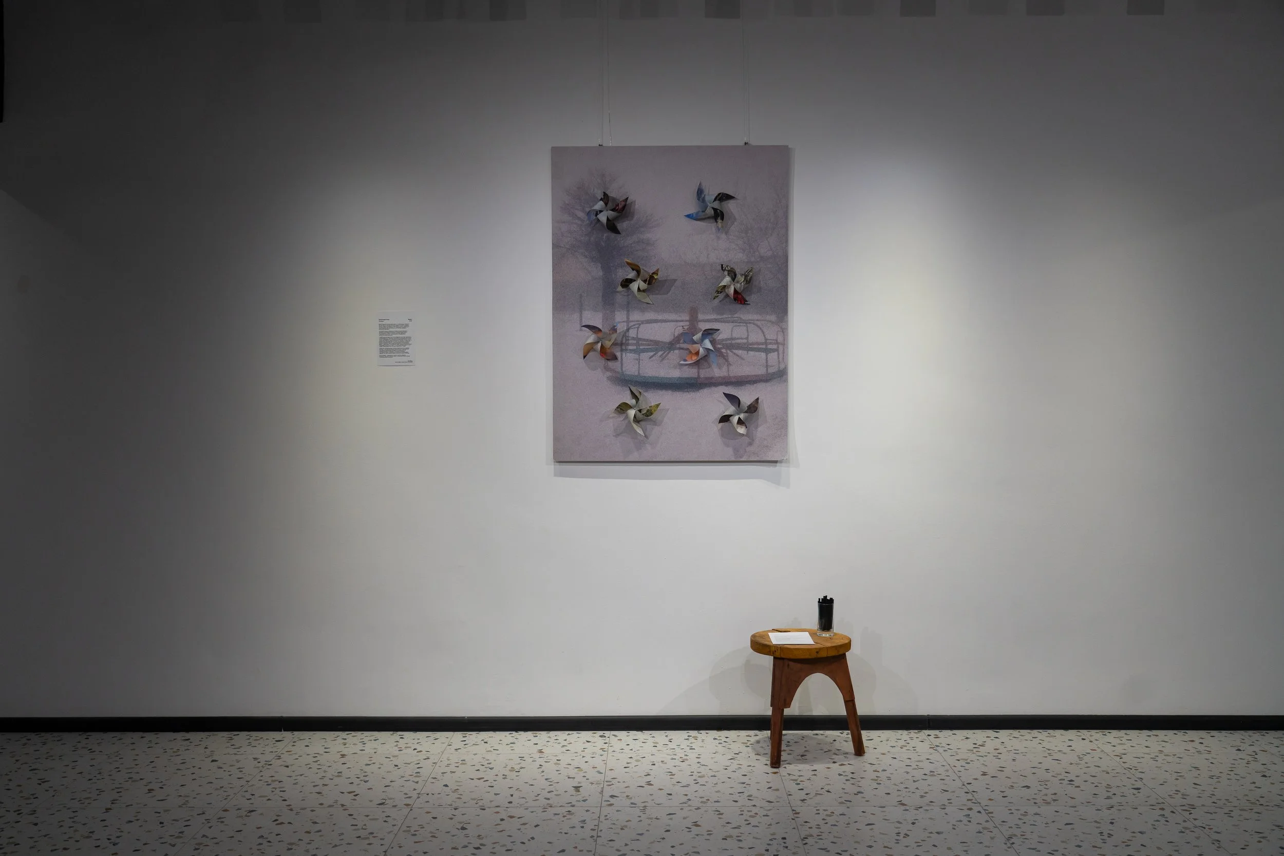 The installation "Exhale" combines the image of the Mariupol carousel with fragile paper windmills placed on top of it. These windmills are transformed photographs-memories sent by the participants of the open call.